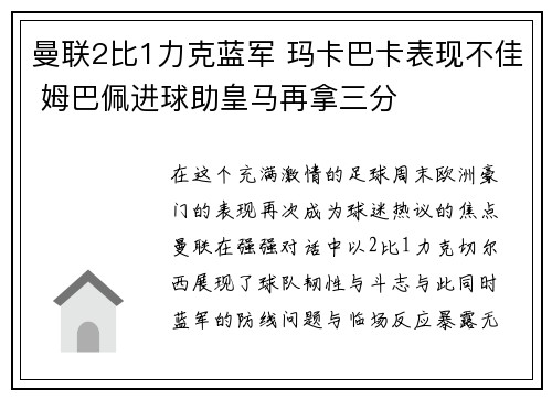 文章摘要:近期,关于马萨拉筹划多夫比克与圣地亚哥互换交易的新闻引发了广泛的讨论与热议。该交易悬念未解,成为了媒体和球迷关注的焦点。虽然交易双方并未最终确定,但关于这笔交易的多方细节和可能带来的影响,依然引发了大量的猜测与分析。本文将从四个主要方面,分别探讨这一交易的背景、各方反应、可能的影响以及交易...